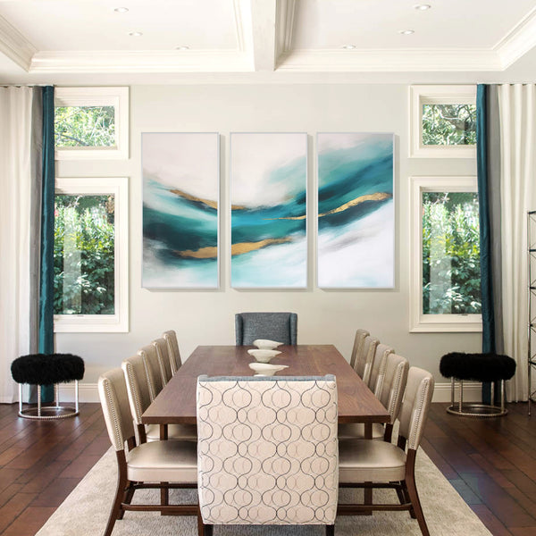 Triptych paintings can visually extend a single scene across three panels. This is especially effective for landscapes, ocean views, or abstract flows, where the composition unfolds gradually from one panel to the next.