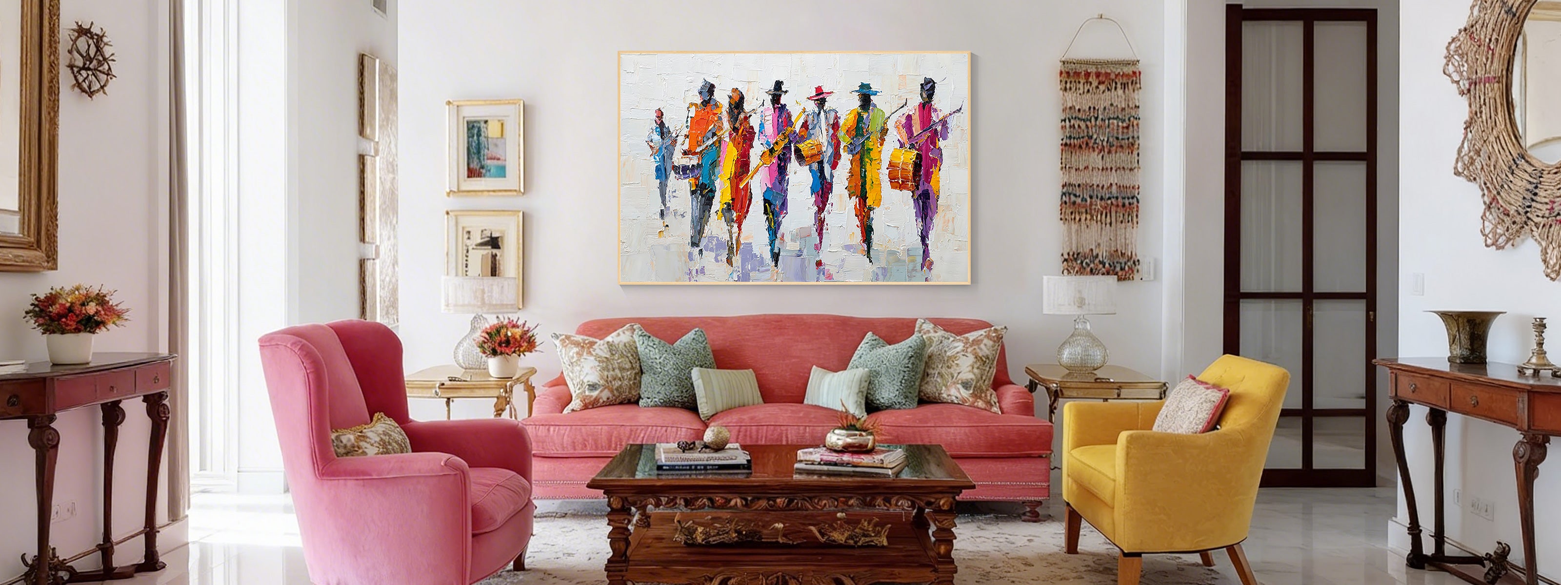 Inspired by modern cubism, the composition features stylized musicians formed through strong geometric shapes and expressive color contrasts. The raised paint surface enhances the tactile quality of the piece, making it ideal for contemporary interiors that value originality and artistic presence.